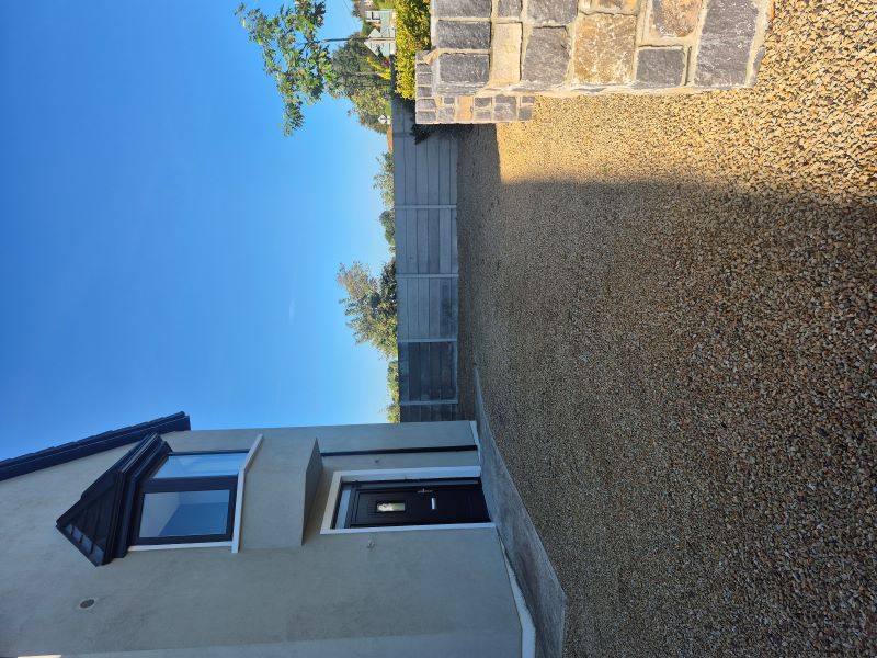 Gravelled driveway with cut limestone boundary wall.